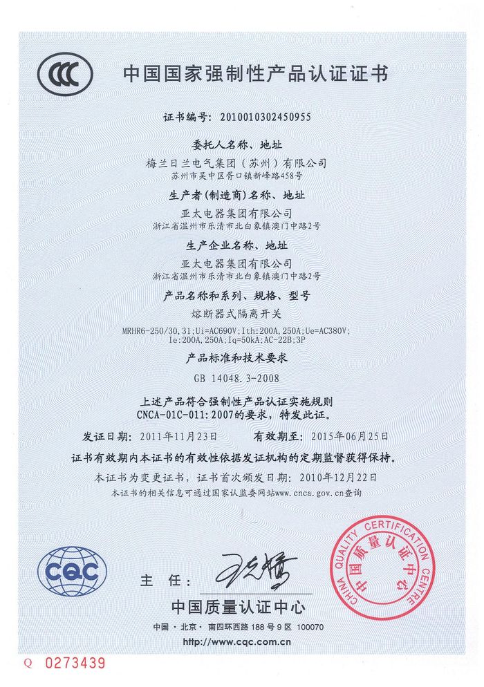 MRHR6-250熔斷隔離開(kāi)關(guān)資質(zhì)證書(shū)