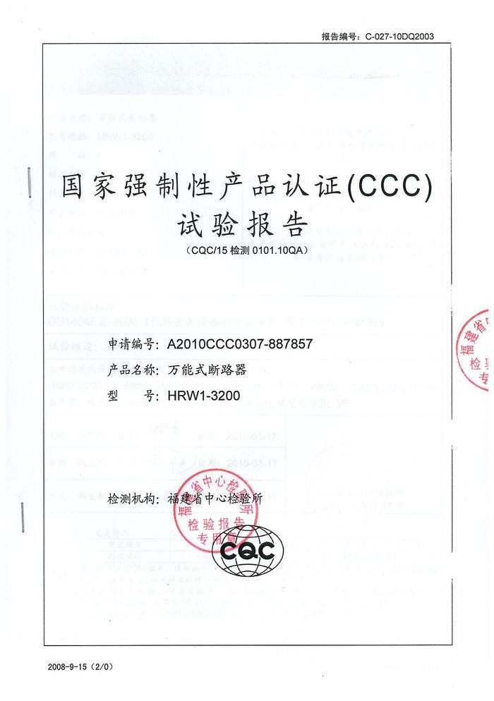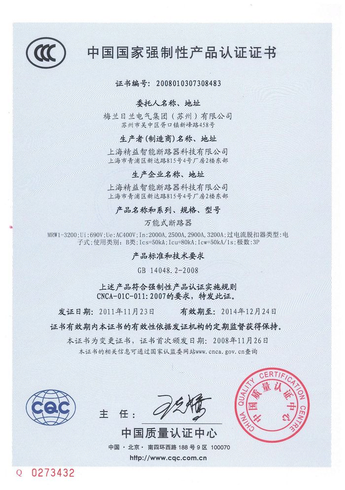 MRW1-3200萬(wàn)能斷路器資質(zhì)證書(shū)
