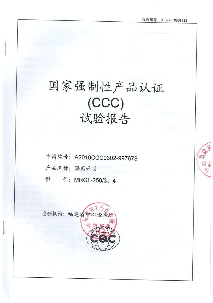 MRGL-250隔離開(kāi)關(guān)資質(zhì)證書(shū)