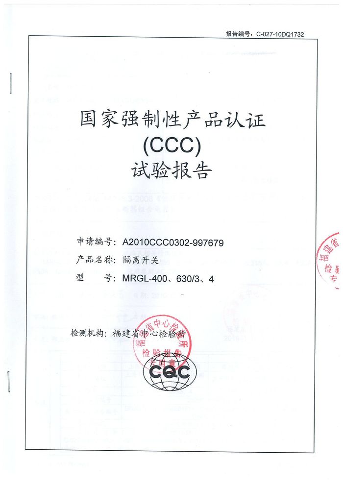 MRGL-400隔離開(kāi)關(guān)資質(zhì)證書(shū)