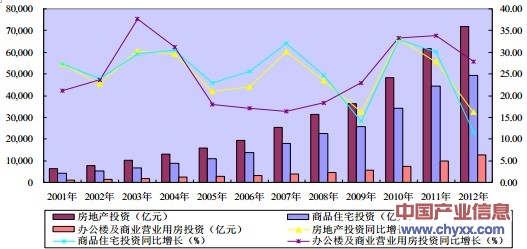 2001-2012年房地產(chǎn)投資、商品住宅投資、辦公樓及商業(yè)營(yíng)業(yè)用房投資和變化趨勢