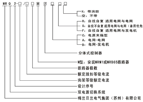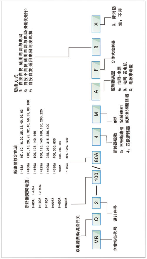 用戶(hù)在訂貨時(shí)應按第4項的型號及含義注明智能系統的型號,規格斷路器框架電流、極數、額定脫扣電流、功能、切換方式。 例如:MRQ2-100/63/4M/B/R智能雙電源自動(dòng)切換系統,塑殼斷路器殼架電流為100A,額定脫扣電流為63A,四級、電網(wǎng)對發(fā)電、自投自復。